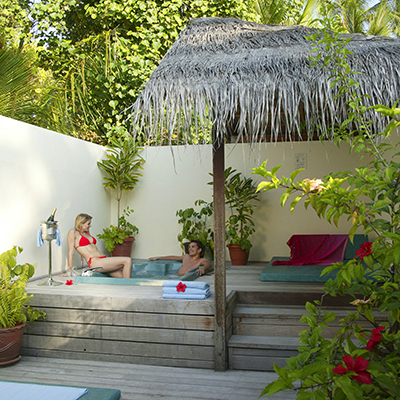 284 rooms include 77 Jacuzzi Water Villas, 27 Water Front Villas, 83 Jacuzzi Beach Villas, 77 Beach Villas and 20 Garden Rooms. All feature tropical décor, king size bed, tile or wood floor, private porch with furniture, air-conditioning, overhead ceiling fan, sitting area, stocked Mini Bar with refrigerator, complimentary tea/coffee, IDD telephone, Bluetooth Speaker, color cable TV, complimentary high speed broadband Internet connection, personal safe, partially open-air bathroom (except Garden Rooms) with shower, double sinks (except Garden Rooms), rain shower, bath accessories, hair dryer, bathrobes, nightly turndown service and complimentary use of chaise lounges at the beach and pool and beach towels. Electricity is 220VAC, 50HZ